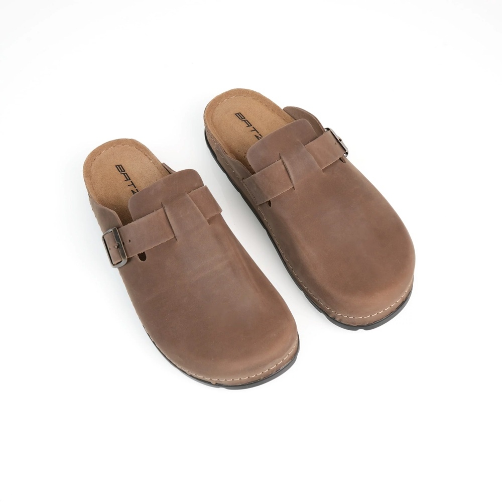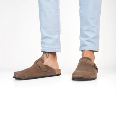 A barna színű, zsíros marhabőr felsőrész elegáns megjelenést és időtálló minőséget képvisel. Az állítható pánt révén könnyedén személyre szabható, így tökéletesen illeszkedik a láb formájához.