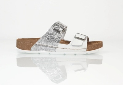 Batz Mallorca női papucs White-Silver / fehér-ezüst színben. Lépj bele a mindennapi kényelembe egy csipetnyi ragyogással: a Batz Mallorca White-Silver egyedi karakterét a fehér barkás bőr természetes textúrája és a fényes ezüst szín emeli ki, mely diszkréten csillog minden lépésnél.