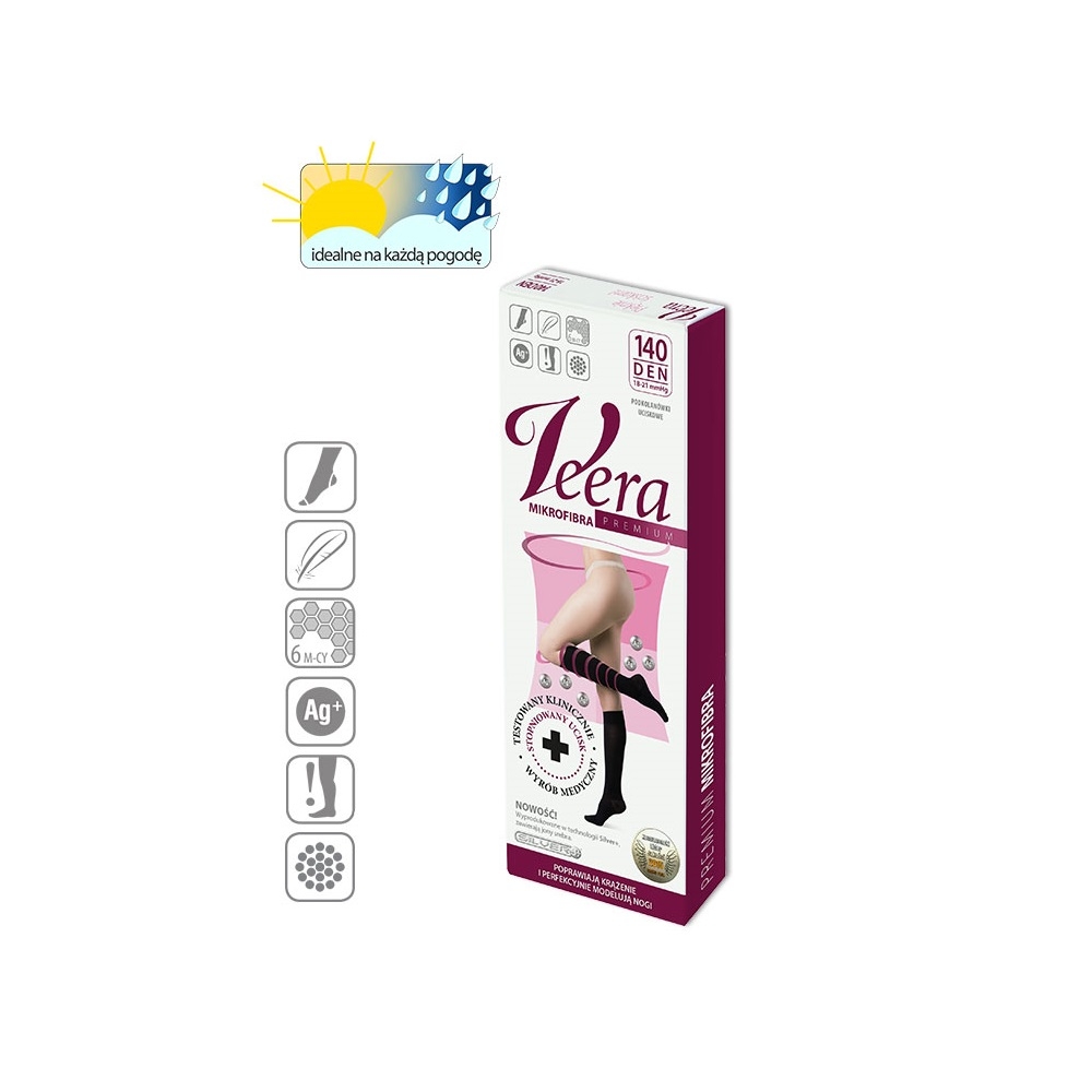 A Veera Premium termékcsaládja egy igen magas minőségű orvostechnikai eszköz, melyet elsősorban megelőzésre, illetve a vénás érelváltozások első tüneteinek kezelésére ajánlunk. A Veera termékek gondosan kalibrált, fokozatos kompresszióval javítják a vérkeringést, csökkentik a duzzanatot és az elnehezült láb érzetét. Klinikailag tesztelt, tar tós, finom tapintású anyagból készültek, melyeket a Silver+ ezüst-ion technológia tesz még hatékonyabbá és különlegesebbé.